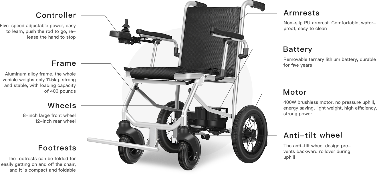 Moves effortlessly in tight spaces, easily passes through narrow indoor doorways. The entire wheelchair is lightweight and flexible, allowing for smooth indoor navigation.