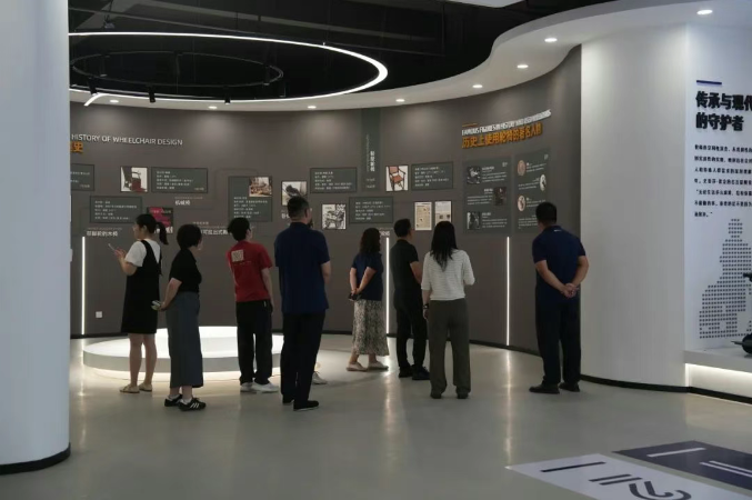 在賀君萍總經(jīng)理的陪同下,聯(lián)合調(diào)研團(tuán)隊(duì)一行重點(diǎn)參觀了互邦企業(yè)展廳。在承載著互邦35年發(fā)展印記的展廳內(nèi),調(diào)研團(tuán)隊(duì)深入了解了互邦從創(chuàng)立至今的發(fā)展歷程、重要里程碑以及在康復(fù)輔具領(lǐng)域取得的豐碩成果。賀君萍總經(jīng)理向各位領(lǐng)導(dǎo)專家介紹了互邦傳承與創(chuàng)新并重的品牌故事,以及涵蓋手動輪椅、電動輪椅、代步車等全系列、家族化的產(chǎn)品展示區(qū)。調(diào)研團(tuán)隊(duì)對互邦深厚的歷史積淀、持續(xù)的技術(shù)創(chuàng)新以及完善的產(chǎn)品體系表示贊賞,尤其對電動輪椅在安全性與可靠性方面的持續(xù)投入表示高度關(guān)注。